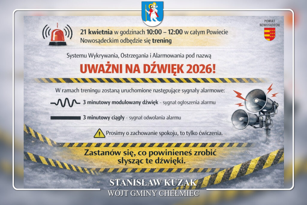 Gmina Chełmiec informuje, że w dniu 21 kwietnia 2026 r. (wtorek) w godzinach 10:00–12:00 na terenie całego powiatu nowosądeckiego odbędzie się trening Systemu Wykrywania, Ostrzegania i Alarmowania pod nazwą „Uważni na dźwięk 2026”.