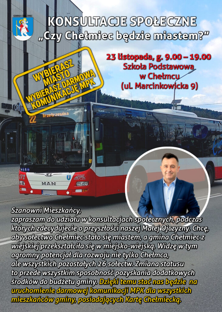 Konsultacje społeczne „Czy Chełmiec będzie miastem?” odbędą się 23 listopada 2025, w godz. 9.00-19.00 w Szkole Podstawowej w Chełmcu (ul. Marcinkowicka 9). Mogą w nich wziąć udział mieszkańcy sołectwa Chełmiec za okazaniem dowodu osobistego.