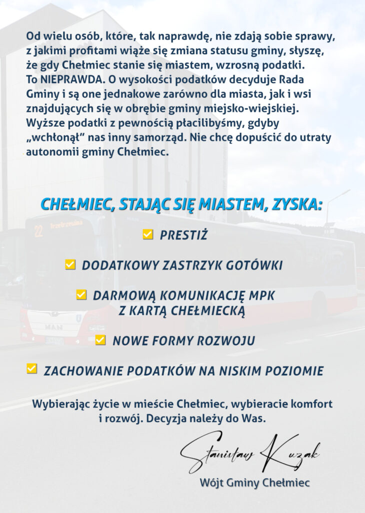 – Zdaję sobie sprawę, że znajdą się osoby, które na siłę będą chciały wykazać minusy. Prawda jest jednak taka, że za zmianą statusu gminy Chełmiec idą same plusy. Po pierwsze, Chełmiec stając się miastem, zyska na prestiżu. Po drugie, będzie mógł zachować przywileje gminy wiejskiej i korzystać z nowych zewnętrznych źródeł finansowania, po które mogą ubiegać się tylko gminy miejsko-wiejskie. Po trzecie, co jest konsekwencją drugiego, zyska dodatkowy zastrzyk gotówki do budżetu gminy i dzięki temu będziemy mogli uruchomić darmową komunikację MPK dla mieszkańców całej gminy, którzy posiadają Kartę Chełmiecką. Po czwarte, status miasta dla Chełmca, pozwoli nadać kierunek rozwoju pozostałym 26 sołectwom – czy to w zakresie turystyki czy sektora przemysłowego i usługowego. Po piąte, Chełmiec zachowa swoją autonomię…
