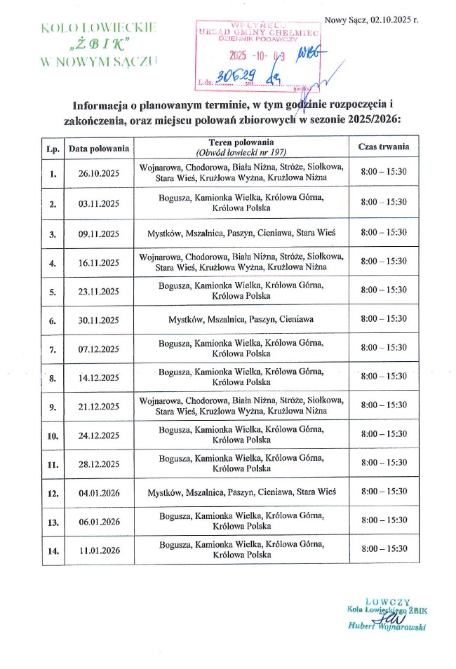 Na prośbę władz Koła Łowieckiego „ŻBIK” z Nowego Sącza, publikujemy dla Państwa plan polowań Koła w obwodzie nr 197, w sezonie 2025/2026r.