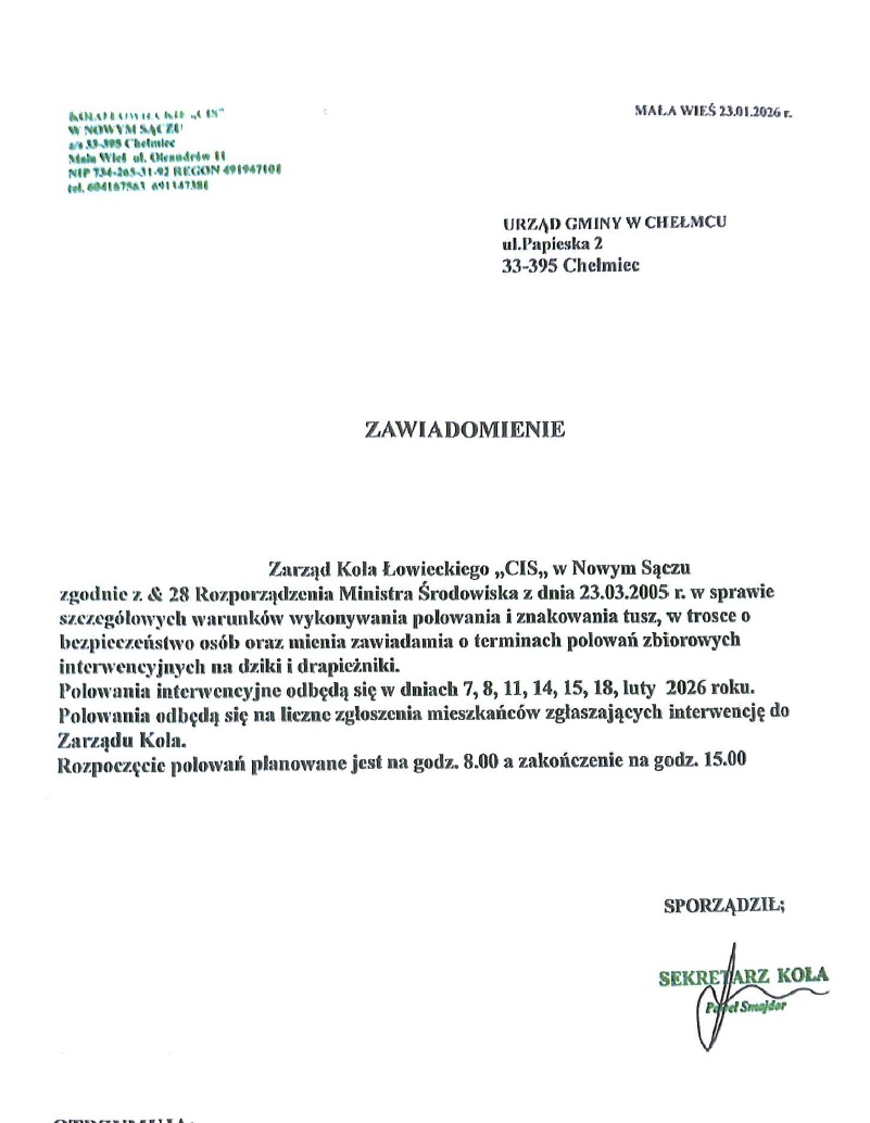 Na prośbę władz Koła Łowieckiego „CIS” z Nowego Sącza, publikujemy dla Państwa ZAWIADOMIENIE dot. polowań zbiorowych, interwencyjnych, które odbędą się dniach: 7, 8, 11, 14, 15, 18 luty 2026 roku.