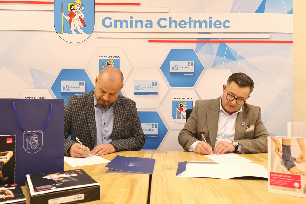 Stół, przy którym wójt Stanisław Kuzak podpisuje deklaracje o współpracy z kolejnymi Parterami Karty Chełmieckiej, wypełnił się produktami medycznymi i sportowymi. Do Programu KCh przystąpił bowiem Sklep medyczny Kickflexmed.