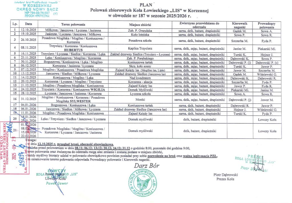 Na prośbę władz Koła Łowieckiego „LIS” w Korzennej, publikujemy dla Państwa plan polowań Koła w obwodzie nr 187, w sezonie 2025/2026r.