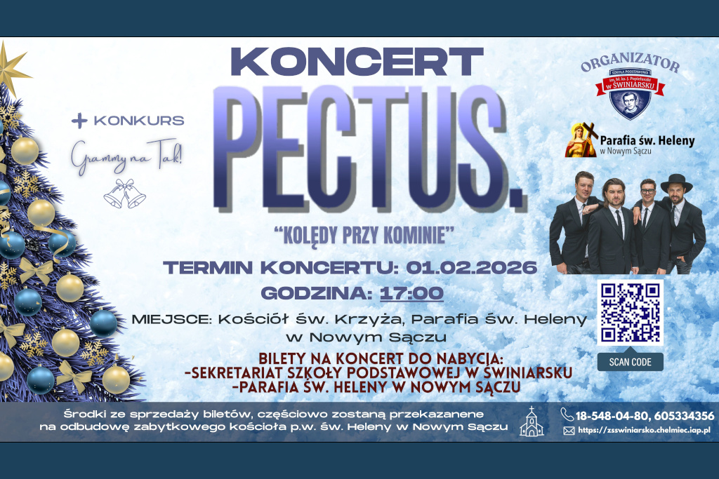 Koncert zespołu Pectus odbędzie się 1 lutego 2026 roku o godz. 17:00 w Kościele św. Krzyża przy Parafii św. Heleny w Nowym Sączu. Dzień wcześniej, 31 stycznia 2026 roku o godz. 9:00, w hali sportowej Szkoły Podstawowej w Świniarsku zaplanowano konkurs muzyczny „Grammy na Tak!”, podczas którego zaprezentują się młodzi artyści wykonujący kolędy, pastorałki i piosenki świąteczne.