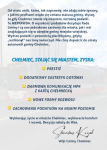 Podniósł także kwestię rozbudowy infrastruktury, w tym budowy ośrodka zdrowia w Chełmcu, o który już czyni starania. Status miasta pozwoliłby pozyskiwać większe środki na inwestycje związane nie tylko z budową ośrodków zdrowia, ale także sportowych, kulturalnych czy rekreacyjnych.