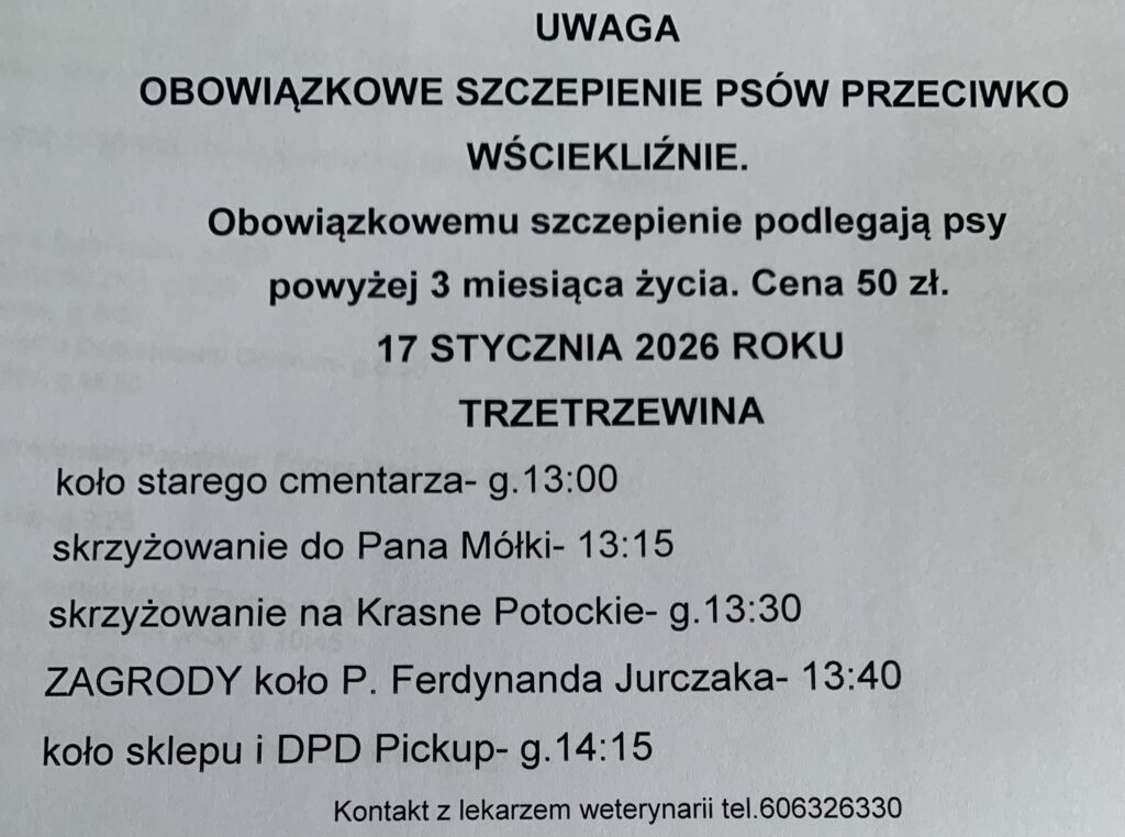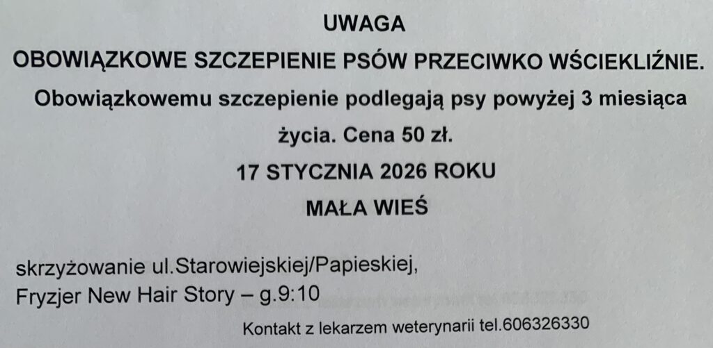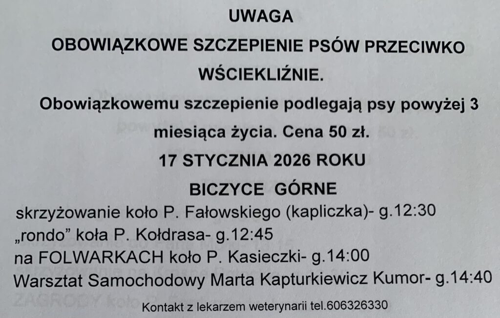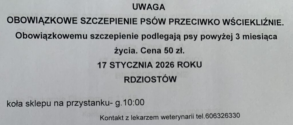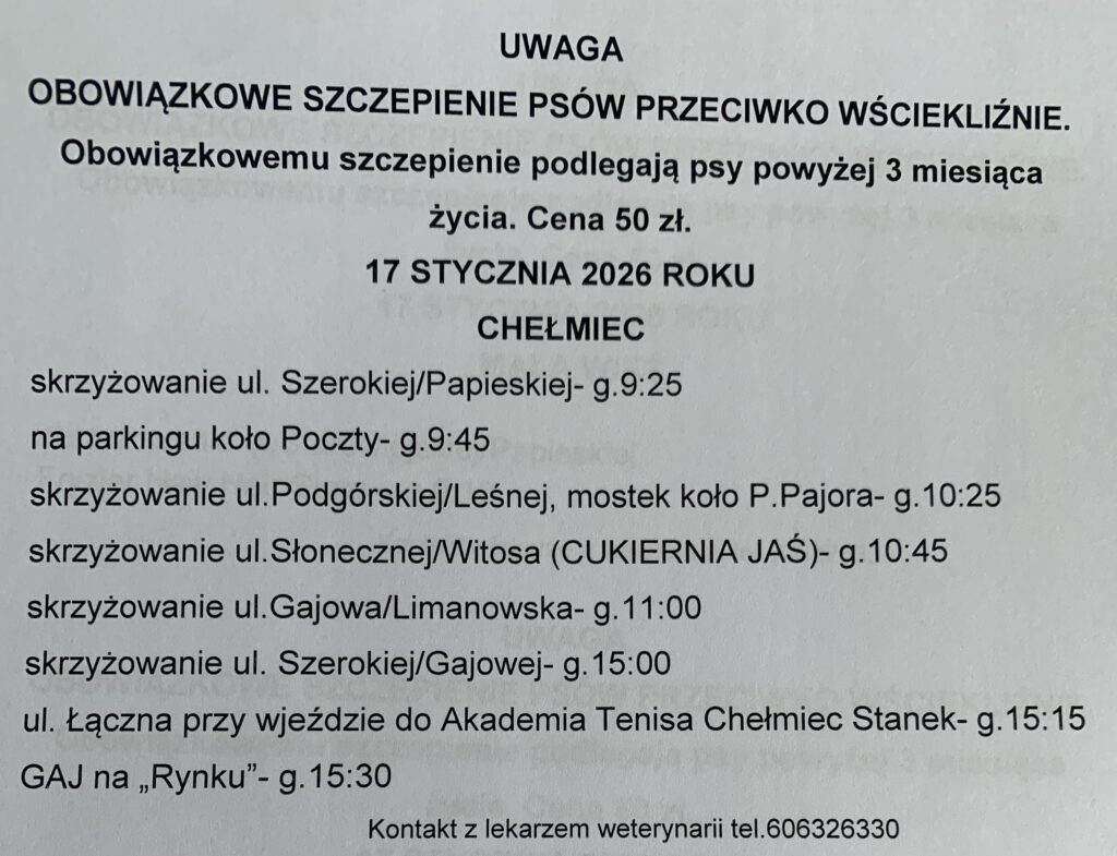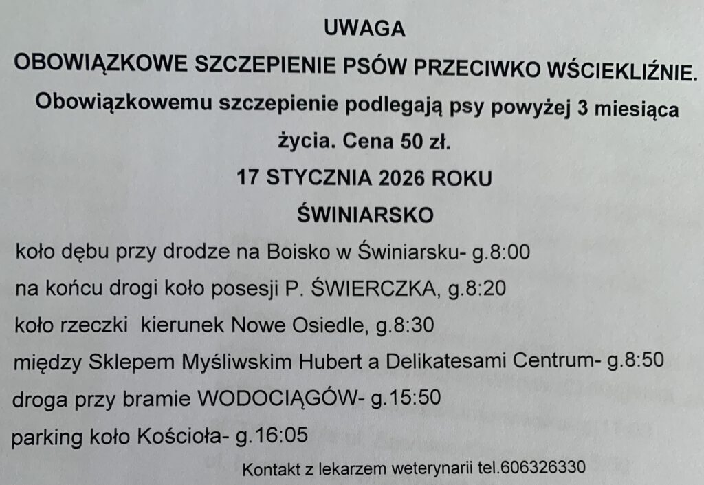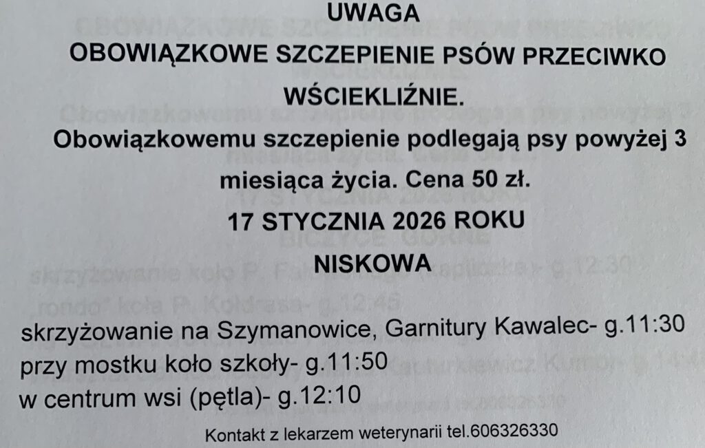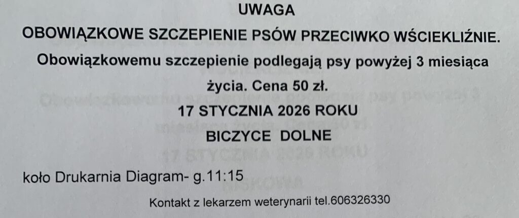 Planowane szczepienia psów przeciw wściekliźnie na terenie gminy Chełmiec w miejscowościach: Świniarsko, Chełmiec, Mała Wieś, Rdziostów, Biczyce Dolne, Niskowa, Biczyce Górne, Trzetrzewina w dniu 17-01-2026r.