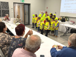 Podczas wydarzenia dzieci zaprezentowały piosenki i wierszyki o bezpieczeństwie na drodze oraz wręczyły seniorom odblaskowe opaski i koniczynki – symbole szczęścia i bezpieczeństwa.