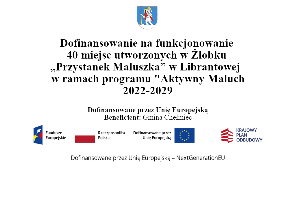 Gmina Chełmiec otrzymała dofinansowanie w ramach Programu Fundusze Europejskie oraz budżetu państwa na realizację zadania: Zapewnienie funkcjonowania 40 nowych miejsc opieki nad dziećmi w wieku do lat 3, utworzonych w Żłobku „Przystanek Maluszka” w Librantowej ze środków FERS w ramach Programu rozwoju instytucji opieki nad dziećmi w wieku do lat 3 Aktywny Maluch 2022-2029.