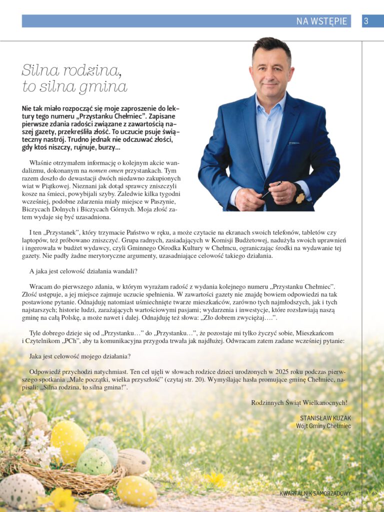 Wracam do pierwszego zdania, w którym wyrażam radość z wydania kolejnego numeru „Przystanku Chełmiec”. Złość ustępuje, a jej miejsce zajmuje uczucie spełnienia. W zawartości gazety nie znajdę bowiem odpowiedzi na tak postawione pytanie. Odnajduję natomiast uśmiechnięte twarze mieszkańców, zarówno tych najmłodszych, jak i tych najstarszych; historie ludzi, zarażających wartościowymi pasjami; wydarzenia i inwestycje, które rozsławiają naszą gminę na całą Polskę, a może nawet i dalej. Odnajduję też słowa: „Zło dobrem zwyciężaj….”.